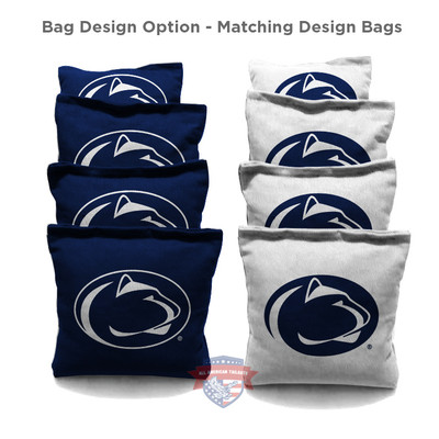 Make your Penn State University Nittany Lions Set complete with custom logo Cornhole Bags. Each bag weighs 15-16 ounces and comes with a custom Penn State University Nittany Lions Cornhole logo on it. Set contains 8 bags: 2 sets of 4 alternating colors. Handcrafted in the USA from the finest materials. Add to your order.