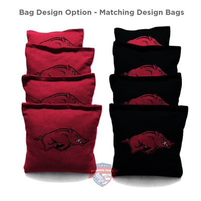Make your University Of Arkansas Cornhole Set complete with custom logo Cornhole Bags. Each bag weighs 15-16 ounces and comes with a custom University Of Arkansas Cornhole Bags logo on it. Set contains 8 bags: 2 sets of 4 alternating colors. Handcrafted in the USA from the finest materials. Add to your order.