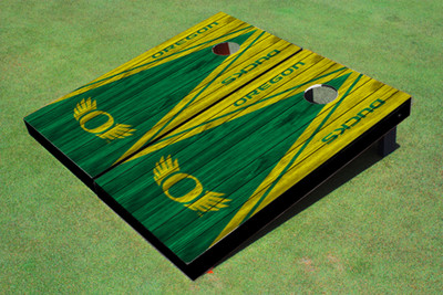 Go Ducks Go!! This is a University of Oregon "Wings" Hunter and Yellow Matching Wood Look Triangle Cornhole Boards set and is perfect for tailgate parties or post victory celebrations. The set is ACA Regulation Sized (48 inches long by 24 inches wide with a 6 inch diameter hole) by default and comes complete with 2 sets of 4 colored duck cloth bags. Made in the USA out of high-quality materials and craftsmanship. No assembly required, ready to play. Order your set today and enjoy your next party playing games with friends and fellow fans.