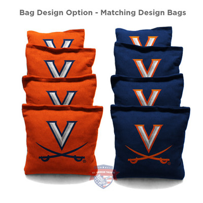 Make your University of Virginia Custom Cornhole Boards Set complete with custom logo Cornhole Bags. Each bag weighs 15-16 ounces and comes with a custom University of Virginia logo on it. Set contains 8 bags: 2 sets of 4 alternating colors. Handcrafted in the USA from the finest materials. Add to your order.